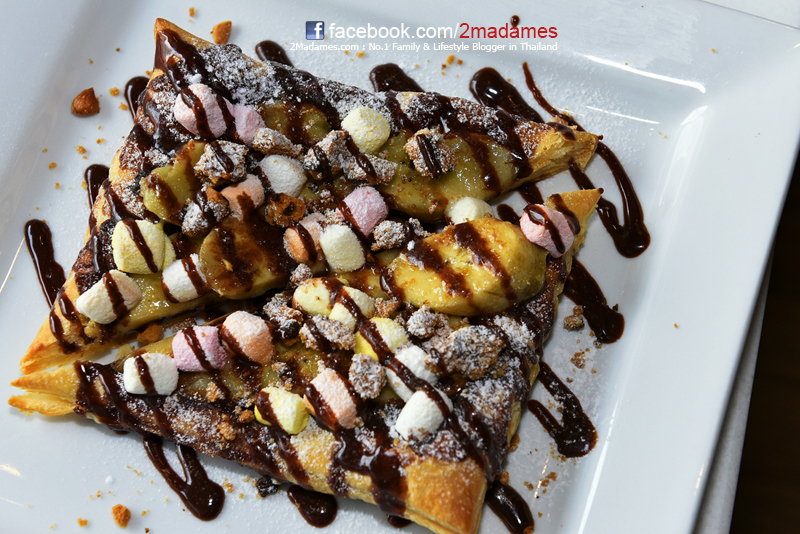 ซอสครีมช็อกโกแลตเสิร์ฟคู่กับมาร์ชแมลโลว์ย่าง กล้วยหอม และโรยหน้าด้วยอัลมอนด์ บิสกิต